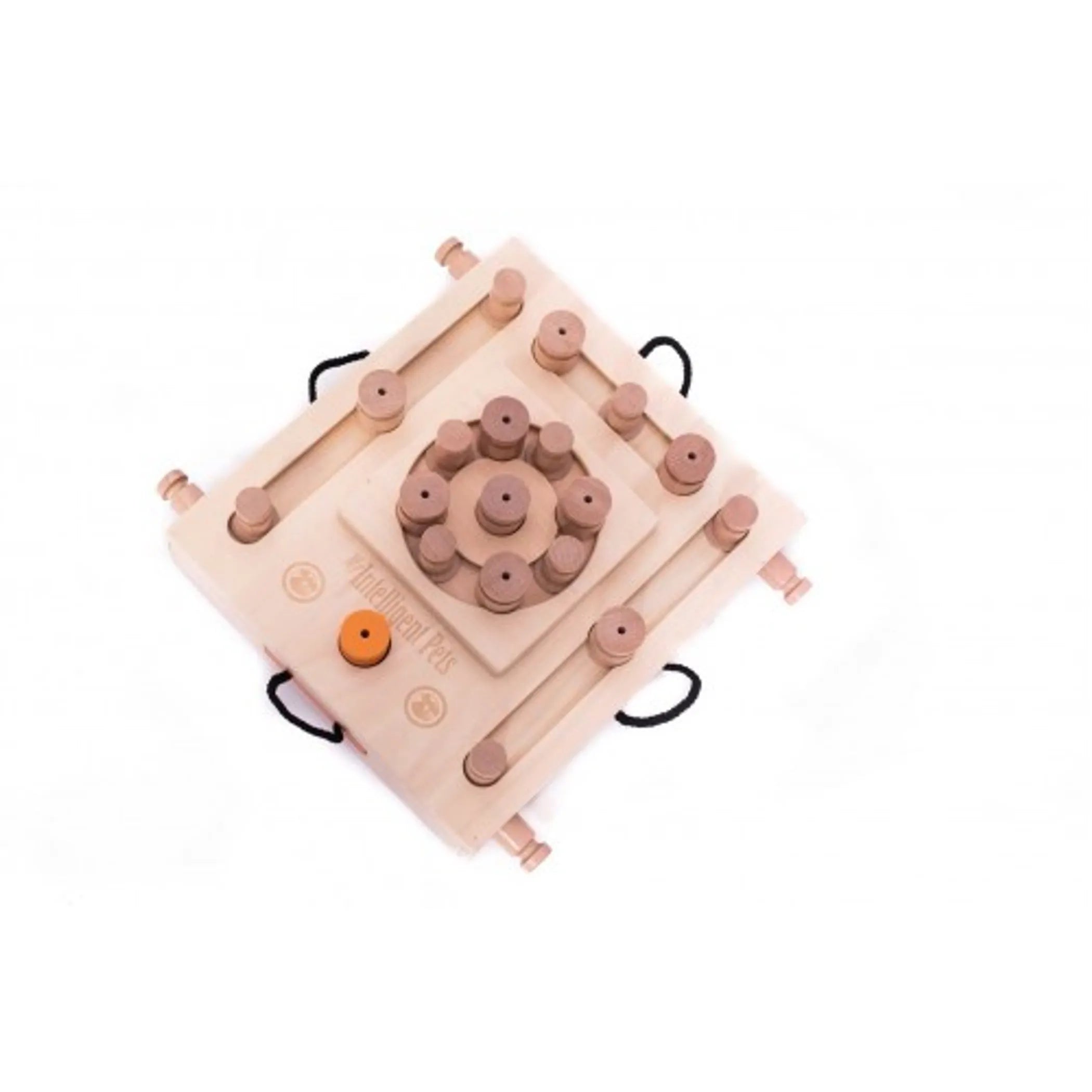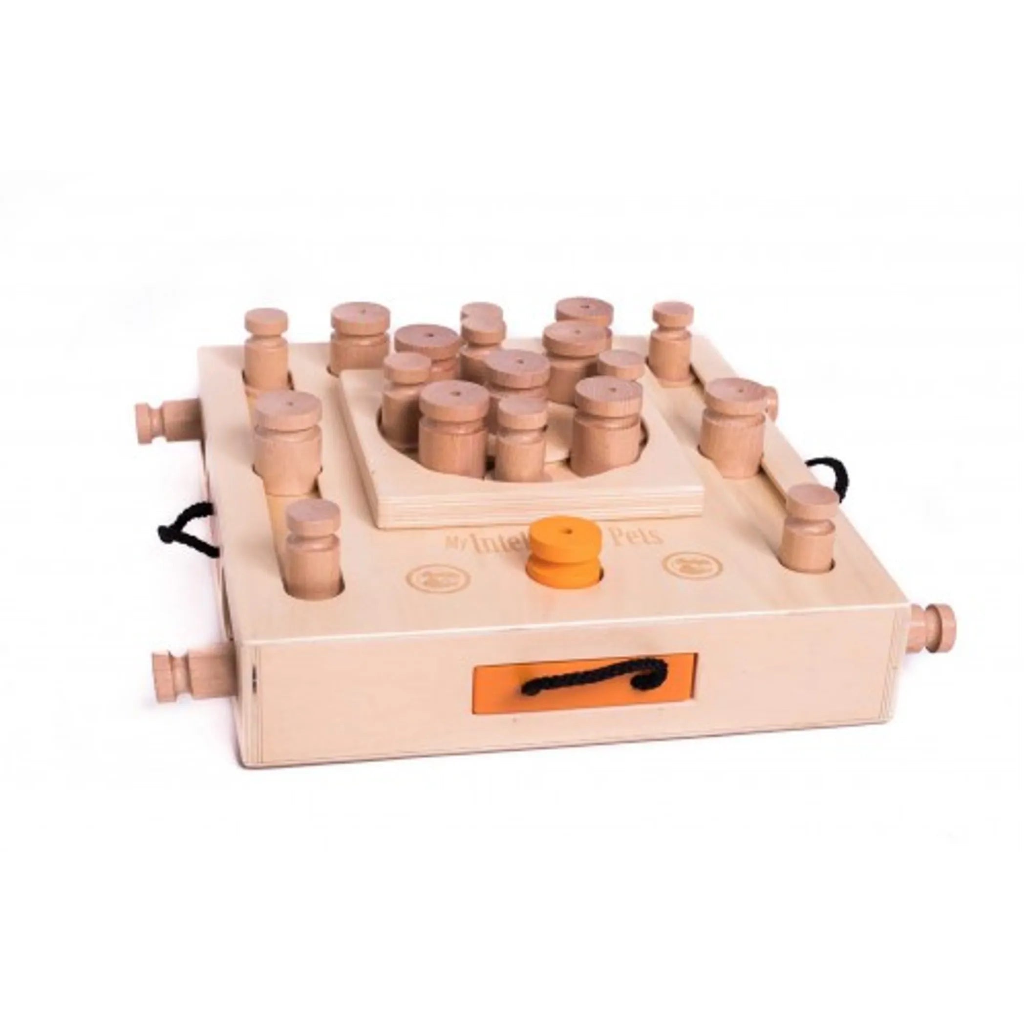 Turtle This multidimensional puzzle is a two-level construction with tracks for hats and barrels where the treats are hidden. The dog has to solve number of tasks to reach them. Turtle comes with 4 drawers that are open by pulling the handle, 9 "cylinders" and 13 "hats". Purchasing additional "hats" to bring their number to 31 will make Turtle one of the most challenging games for your pet with 44 different tasks (4 paws on our level of difficulty). According to dog's behaviorists 10 minutes of mental stimulation with employment of interactive game equivalents to 1 hour of physical exercise. This is especially important for the dogs living in large cities where long walks are difficult and impossible, senior dogs with ailments that do not allow them for prolong outings and those living in cold climates where going outside can put animal's health at risk. Here is how the game works: 1. Hide your dog's favorite treats under "hats" and "cylinders" as well as inside of the drawers . Make sure your dog observes while you are doing it. 2. Encourage verbally your dog to seek the treats hidden inside of the puzzle. 3. The dog will start searching for the treats by knocking down the "cylinders", moving the "hats" to the position that they can be lifted and opening the drawers, where you hid the goodies. 4. Make sure that you praise the dog each time he/she finds the treat. Additional information: Dimensions: 16"x14"x5" Weight: 7lb All our games and puzzles are made from certified wood covered with water-based varnish that is not harmful to humans and animals. Please keep the game dry and free of water exposure, as the wooden pieces may swell otherwise. Use only dry treats for playing with our games Keep out of reach of small children since removable parts can be a choking hazard to them.