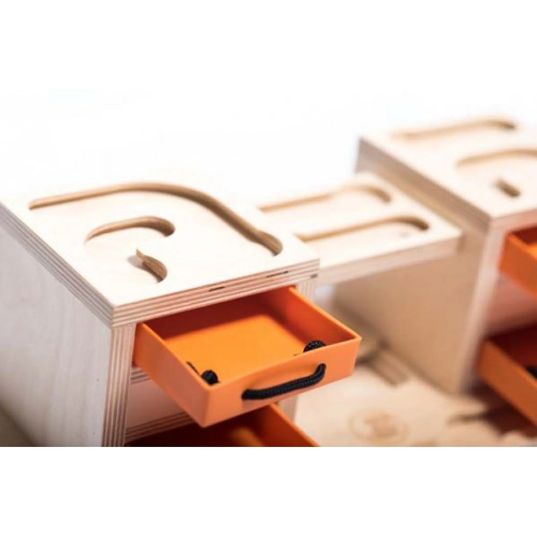 Length: 16.00 Width: 7.00 Height: 5.00 Two towers It is a very challenging game that requires some degree of skill from your dog. Difficulty level varies from 1 paw to 4 paws by adding and removing number of tokens (hats and cylinders) from the structure. This puzzle comes with 6 drawers and 8 of each kind of tokens. By purchasing additional hats the game challenge can be increased to staggering 33 tasks! It is of our all time bestsellers and dogs and their parents have a lot of fun playing with it. According to dog's behaviorists 10 minutes of mental stimulation with employment of interactive game equivalents to 1 hour of physical exercise. This is especially important for the dogs living in large cities where long walks are difficult and impossible, senior dogs with ailments that do not allow them for prolong outings and those living in cold climates, where going outside can put animal's health at risk. How to play: 1. Hide your dog's favorite treat in various places (under "hats" and "cylinders", inside of the drawers, under the trapdoor between the towers). Make sure your pet observes you while you are doing it. 2. Encourage verbally your dog to look for the hidden treats. 3. The treat will be found under the "cylinder" any knocking it down with a paw or a nose and in case of the "hat" by moving it in its track to the position where the "hat" can be lifted revealing the treat. The drawers can be opened by pulling on the string attached to them. 4. Make sure to praise your dog each time he/she finds a treat. Additional information: Dimensions: 18"x9"x7" Weight: 7lb All our games and puzzles are made from certified wood covered with water-based varnish that is not harmful to humans and animals. Please keep the game dry and free of water exposure, as the wooden pieces may swell otherwise. Use only dry treats for playing with our games Keep out of reach of small children since removable parts can be a choking hazard to them.